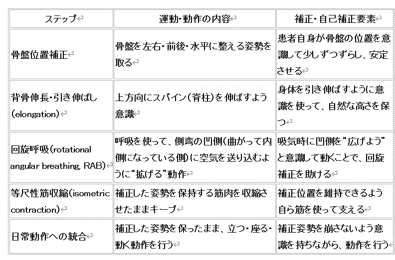“Active self-correction and maintenance of the improved posture during functional activities are two primary goals of the Schroth method.” 訳:Schroth法自体が“能動的自己補正”を目標としており、患者自身が補正を“かけて維持する”動きを重要視します。
